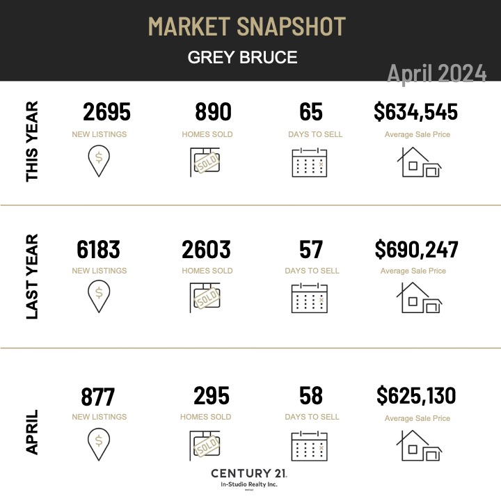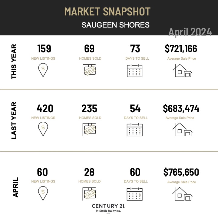 Things are heating up in Spring Real Estate Market in April. Last month we saw 60 new listings in Saugeen Shores vs March’s number of new listings of 48 new listings. 28 Homes sold in April which is a good jump higher than March’s # of 14 sold. Average sale price in Saugeen Shores in April was $765,650. Saugeen Shores is still sitting in a higher price bracket than the rest of Grey and Bruce Counties. It’s a Buyer’s Market out there – if you’re a Buyer this is a great time to buy!